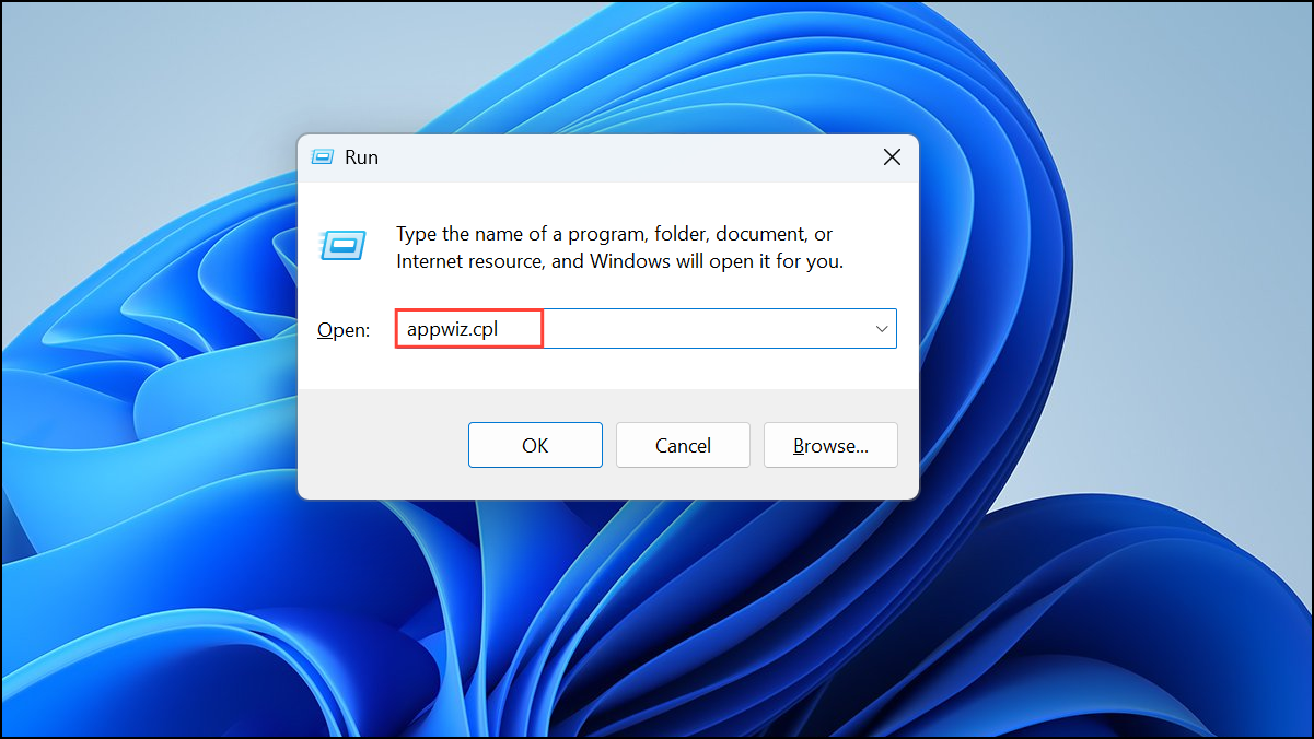Step 1: Press Windows + R, type appwiz.cpl, and press Enter to open Programs and Features.