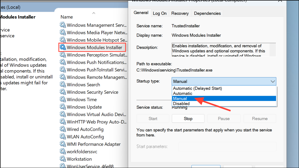 Step 3: If you receive an error when renaming, open Services (services.msc), find Windows Modules Installer, and set its startup type to Manual. Restart your PC and try again.