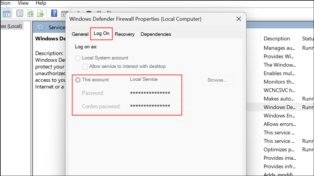 Step 3: Go to the Log On tab. Select This account and enter Local Service as the account name. If your system is password-protected, enter your password twice. Click Apply.
