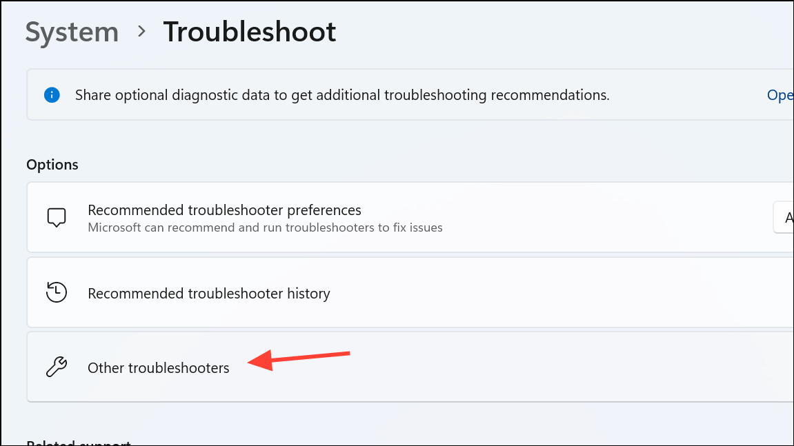 Step 2: In the Troubleshooting window, click on "Other troubleshooters" (Windows 11) or "View all" (Windows 10).