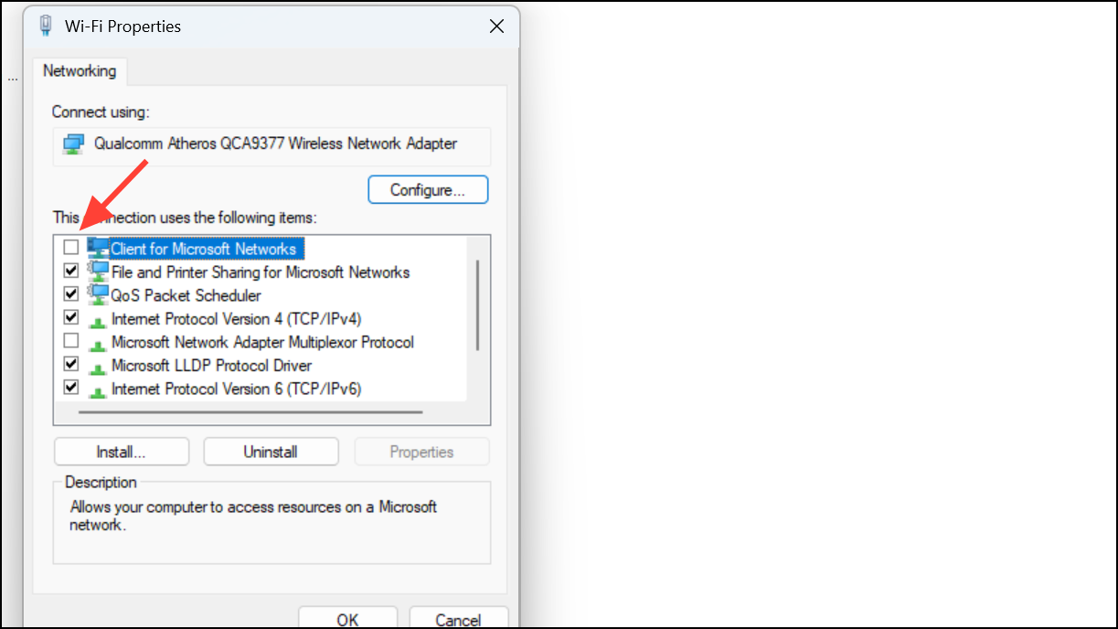 Step 3: In the properties window, uncheck the box next to "Client for Microsoft Networks" and click "OK."
