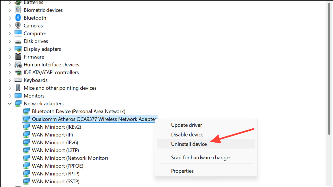 Step 2: Expand the "Network adapters" section, right-click your active network adapter, and select "Uninstall device."