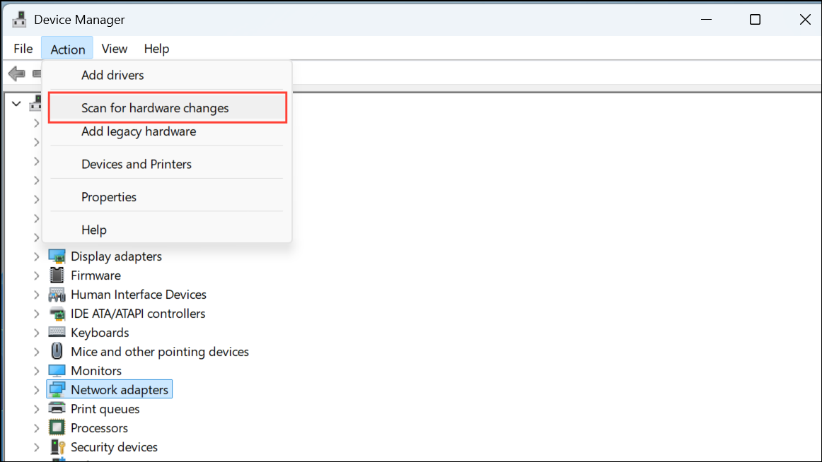 Step 4: After uninstalling, click "Action" from the Device Manager menu and select "Scan for hardware changes" to reinstall the adapter automatically.