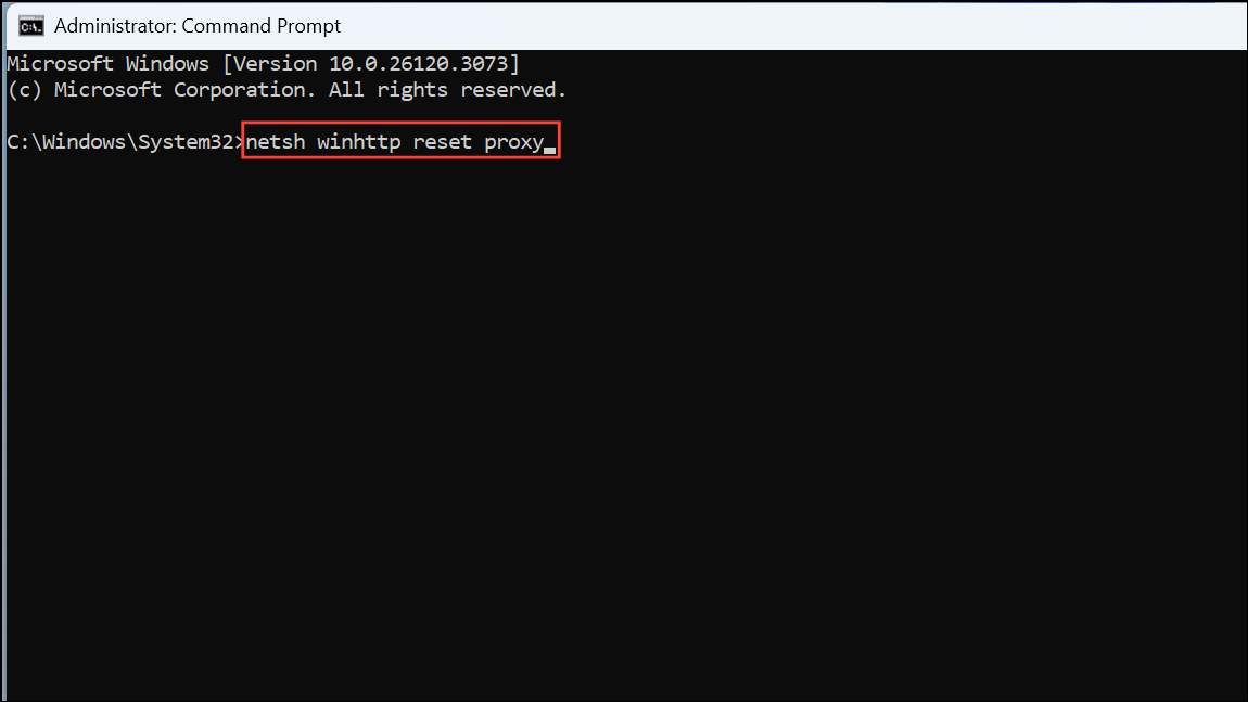 Step 2: Open Command Prompt as an administrator and type the following command to reset proxy settings: