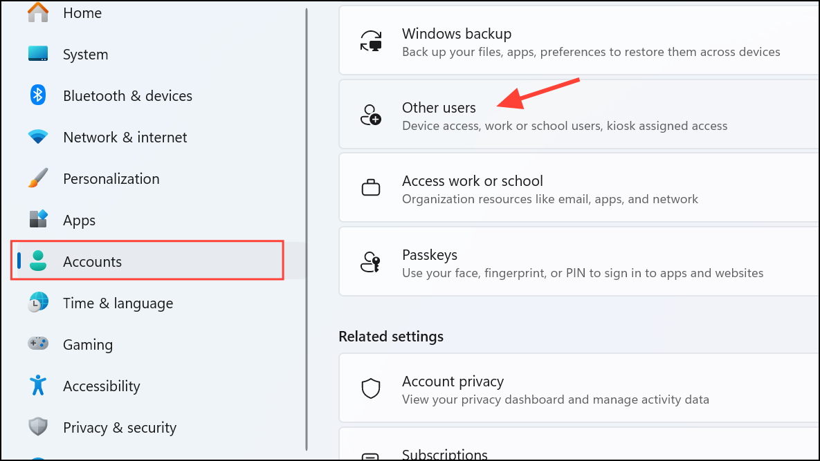 Step 2: Select "Family & other users," then click "Add account" under "Other users."