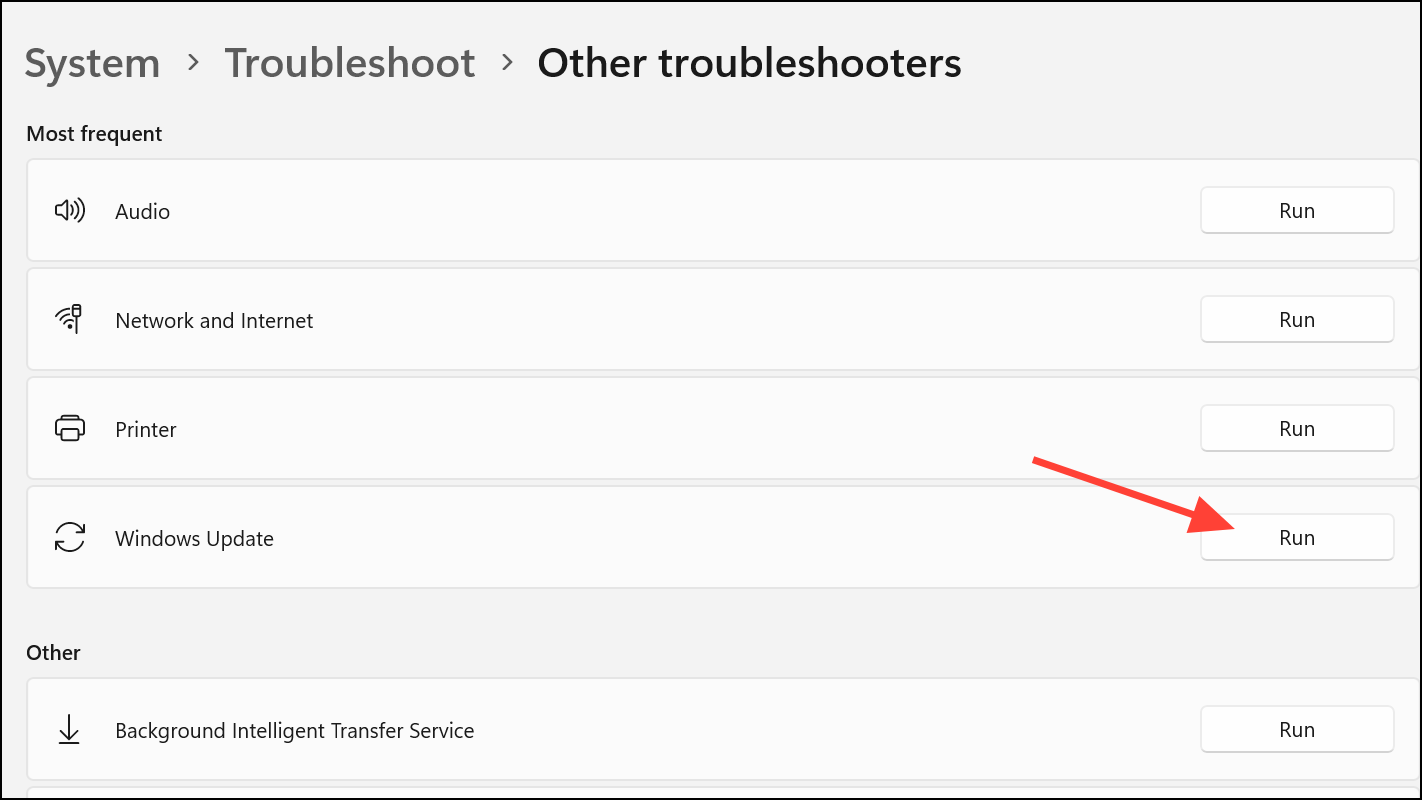 Step 2: Click on Other troubleshooters. Locate Windows Update in the list and click Run next to it. The troubleshooter will automatically check for common problems, such as missing or corrupt files, and attempt to resolve them.