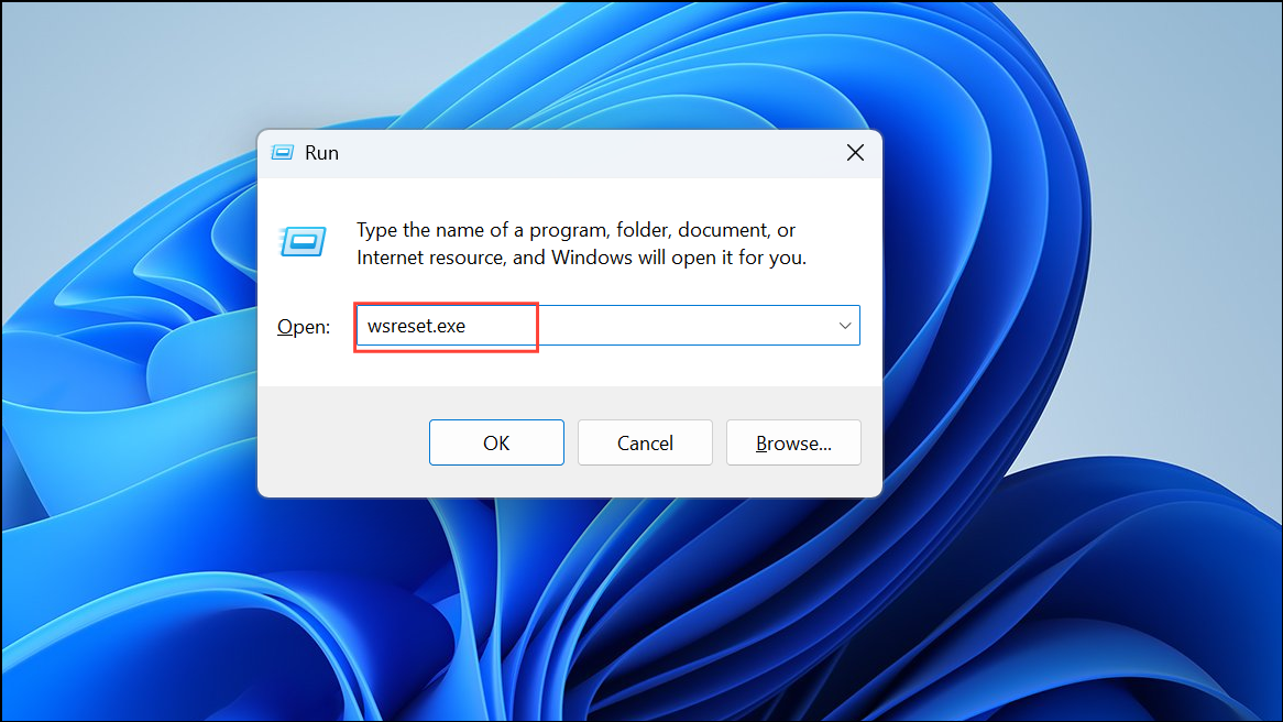 Step 1: Press Windows key + R to open the Run dialog box. Type wsreset.exe and press Enter.