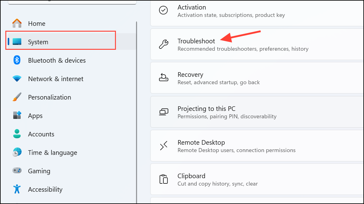 Step 1: Press Windows key + I to open the Settings app. Navigate to "System" and then select "Troubleshoot" from the right pane.
