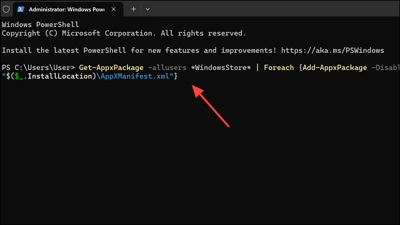 Step 3: Restart your computer. After the system restarts, open Windows Terminal (Admin) again and reinstall the Microsoft Store using the following command: