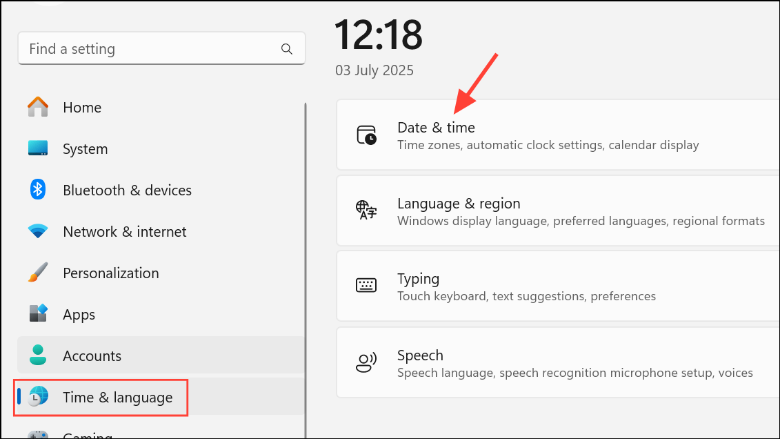 Step 1: If you can access Windows Settings, press Windows + I and navigate to Time & Language > Date & time.