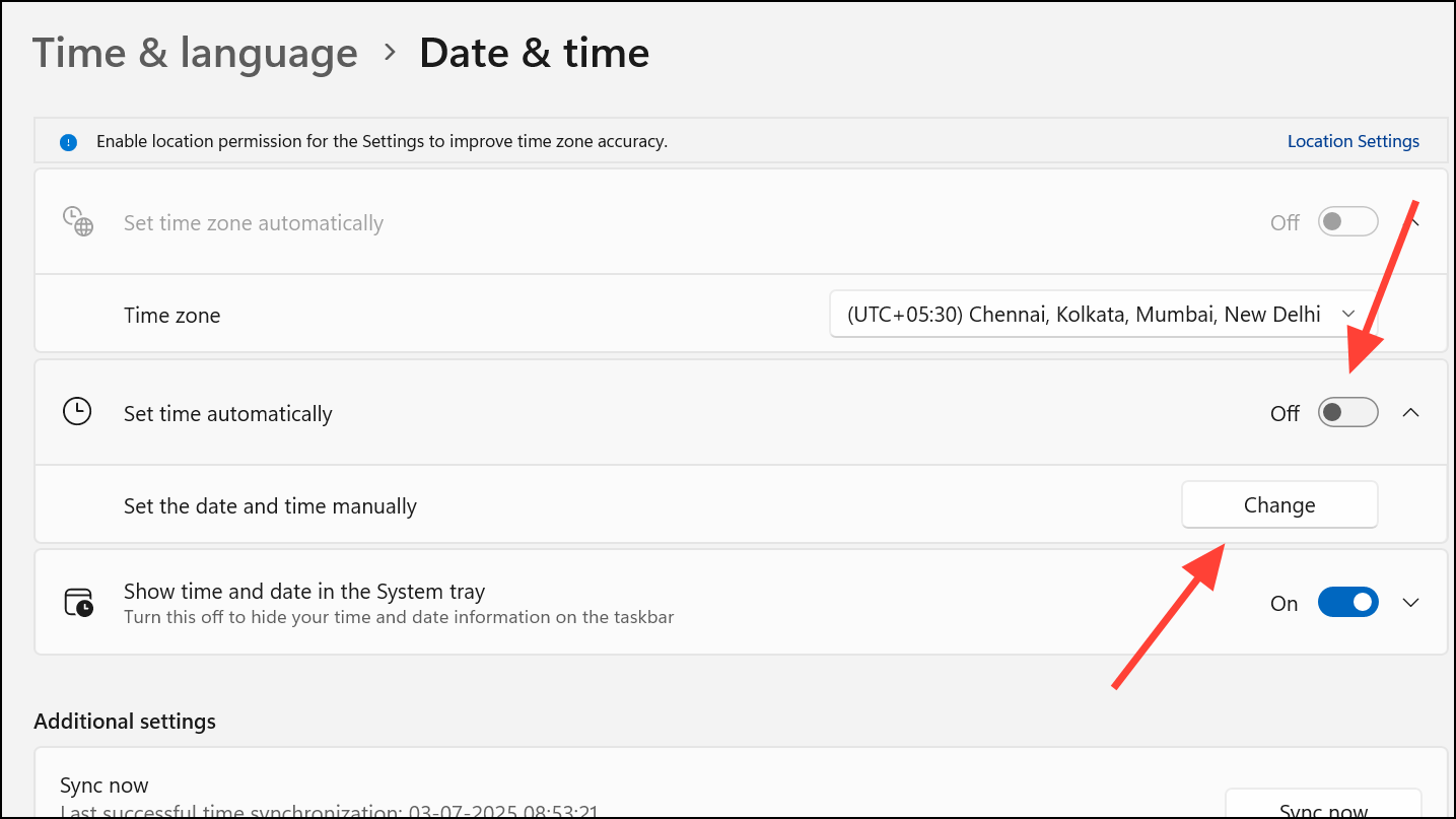 Step 2: Turn off Set time automatically, then click Change under Set the date and time manually. Enter the correct date and time and click Change.