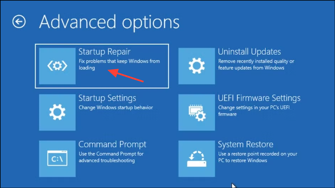 Step 4: Navigate to "Troubleshoot" > "Advanced options" > "Startup Repair." Follow the on-screen instructions and let the repair process complete.