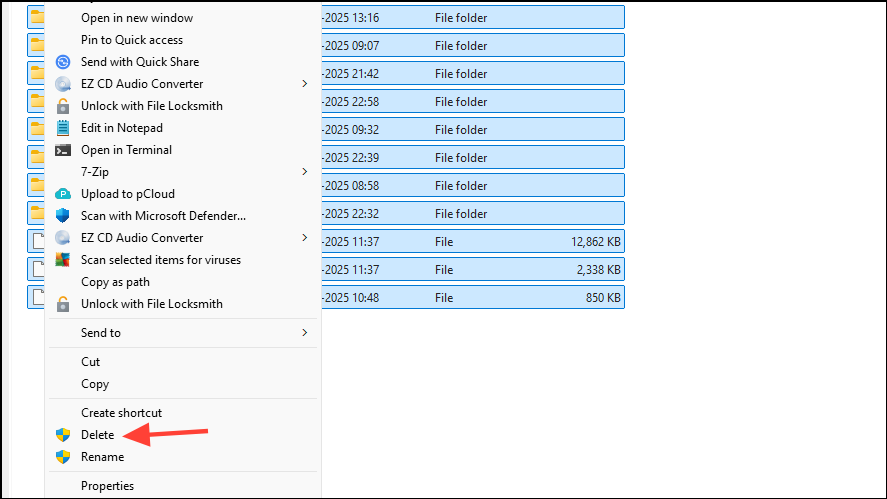 Step 2: Select all files inside the folder by pressing Ctrl + A, then delete them. Confirm any prompts to proceed.