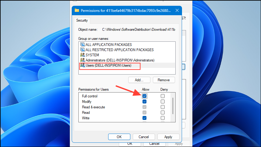 Step 2: Select your user account or the Users group, then ensure the Full Control box is checked. Click Apply and then OK.