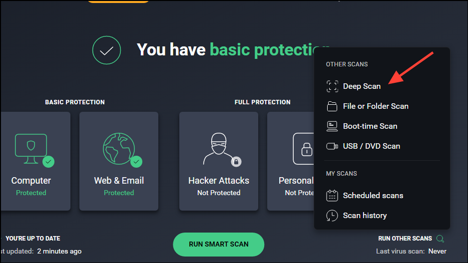 - When your antivirus program is open, look for a scan option and click on it to scan your PC. Make sure to perform a complete scan of your PC. Wait until the scan is finished. If your antivirus detects malware or viruses on your PC, it will delete or quarantine infected files.