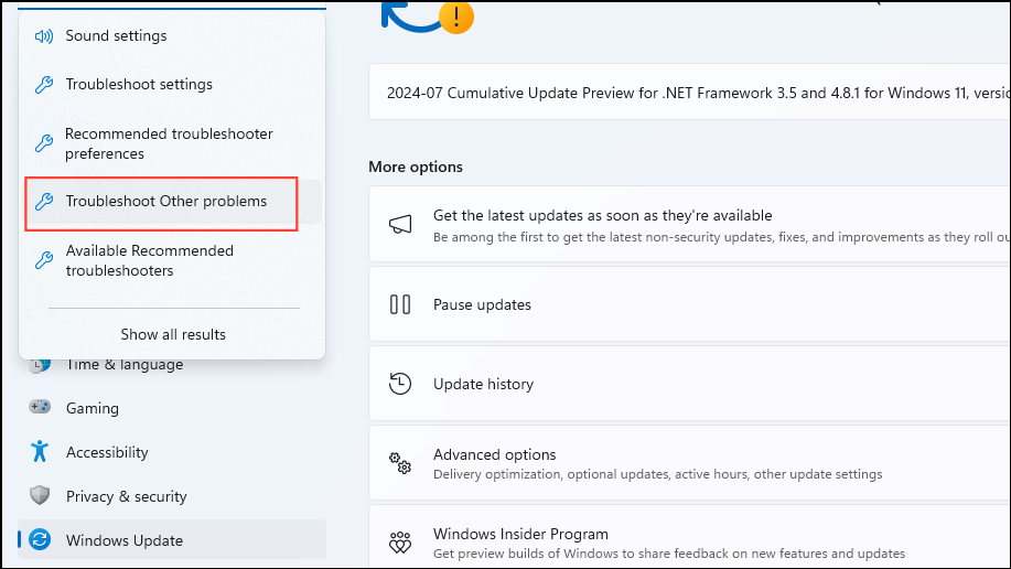 troubleshootin the search box on the left. Then, click on 'Troubleshoot Other problems' in the list of results.