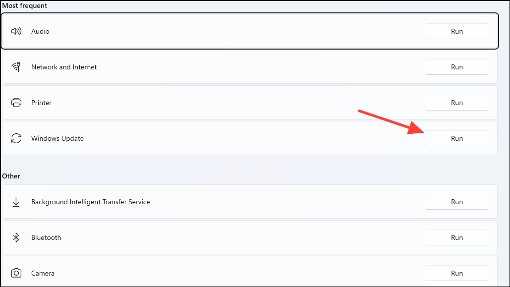 - On the next page, click on the 'Run' button on the right of the 'Windows Update' option.
