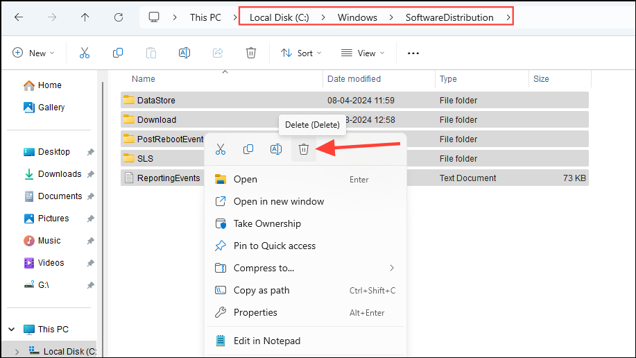 C:\Windows\SoftwareDistribution. Here, select all the contents of the folder and delete them.
