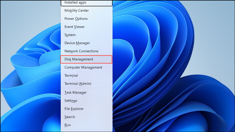 Win + Xto bring up the shortcuts menu and then click on 'Disk Management'.