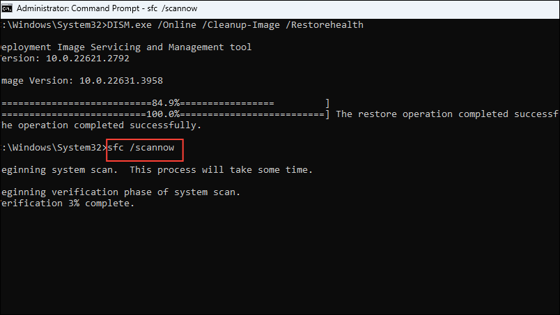 DISM.exe /Online /Cleanup-Image /Restorehealthin the command prompt window and press 'Enter'.