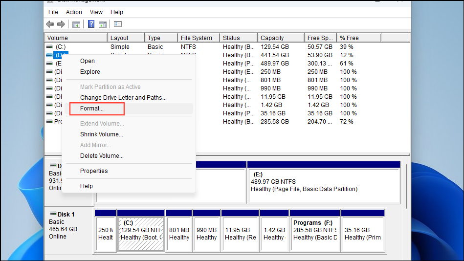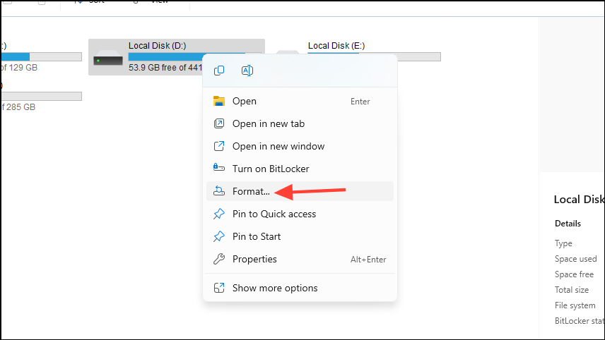 - Alternatively, open File Explorer, right-click on the drive you want to format, and click on 'Format'.