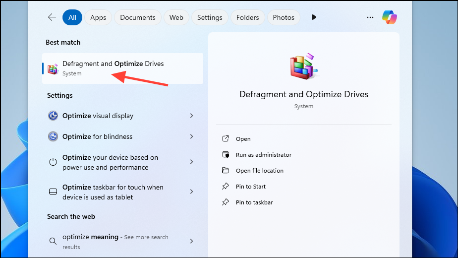 optimize, and then click on 'Defragment and Optimize Drives'.