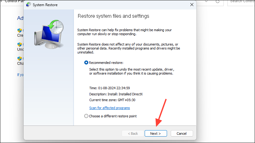 - If you've already created restore points, you will see them here. System Restore will also automatically select the most suitable one. Click on the 'Next' button.