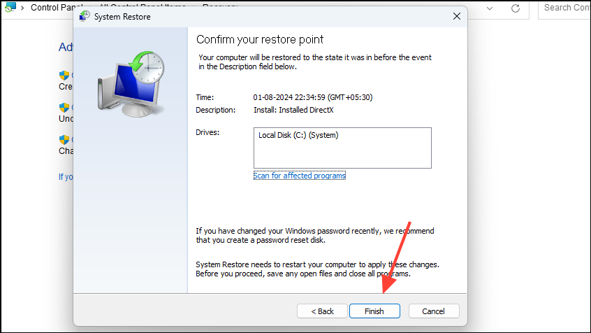- Then click on the 'Finish' button. Your PC will reboot and go back to its earlier state.