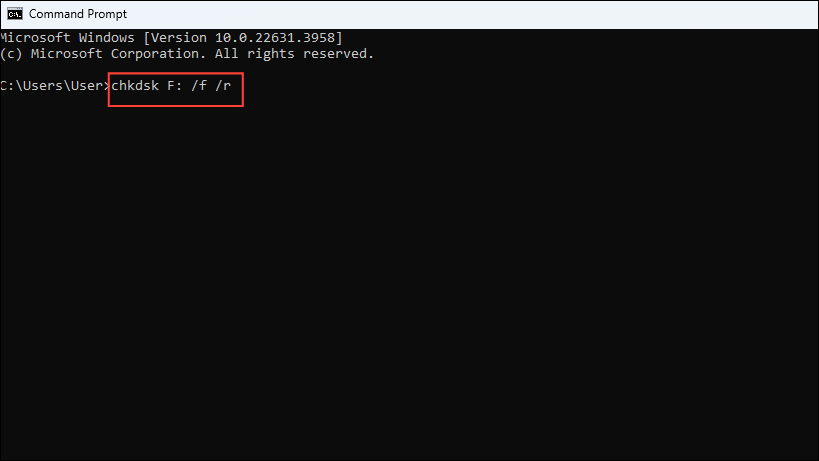 chkdsk F: /f /r. Replace 'F' with the drive letter where you want to install Windows and press 'Enter'.