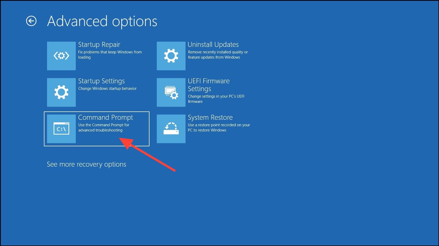 - On the Troubleshoot page, click on 'Advanced Options' and then on 'Command Prompt'.