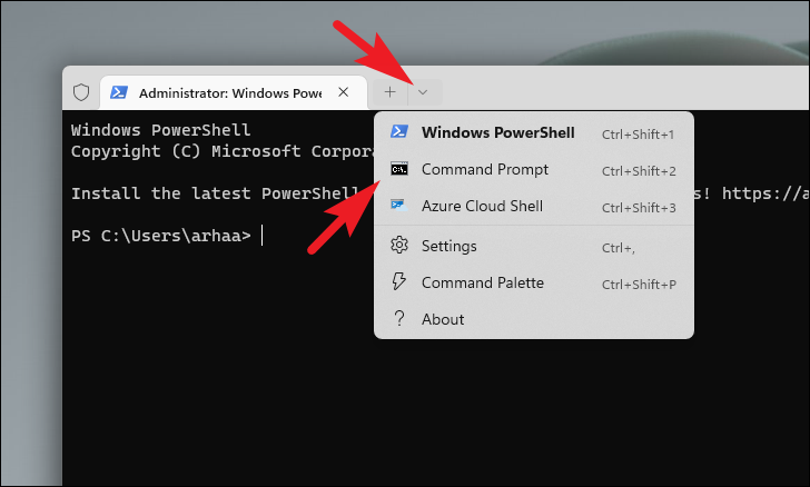 Step 2: In the Terminal, open Command Prompt by clicking the downward arrow at the top and selecting 'Command Prompt'.
