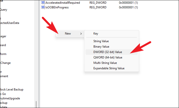 Step 3: Right-click on an empty space in the right pane, hover over 'New', and select 'DWORD (32-bit) Value'. Name the new value AllowOSUpgrade.