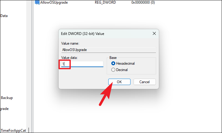 Step 4: Double-click on the newly created AllowOSUpgrade value. In the 'Value data' field, enter 1 and click 'OK'.
