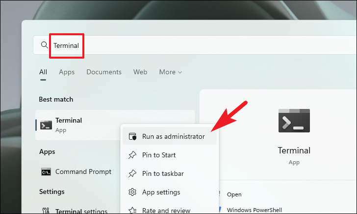 Step 1: Open Windows Terminal as an administrator. Click on the Start Menu, type Terminal, right-click on 'Windows Terminal', and select 'Run as administrator'.