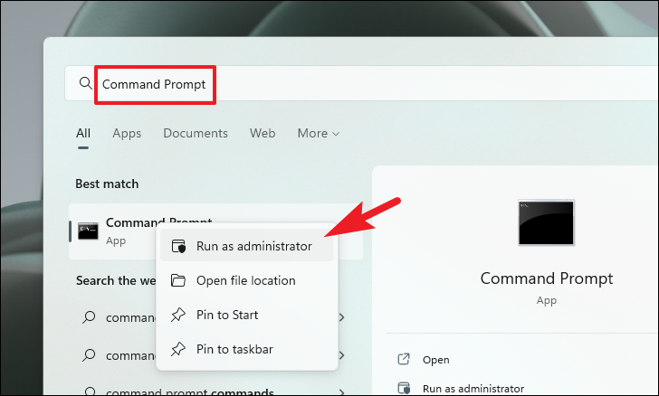 Step 6: Open Command Prompt as an administrator. Click on the Start Menu, type Command Prompt, right-click on it, and select 'Run as administrator'.