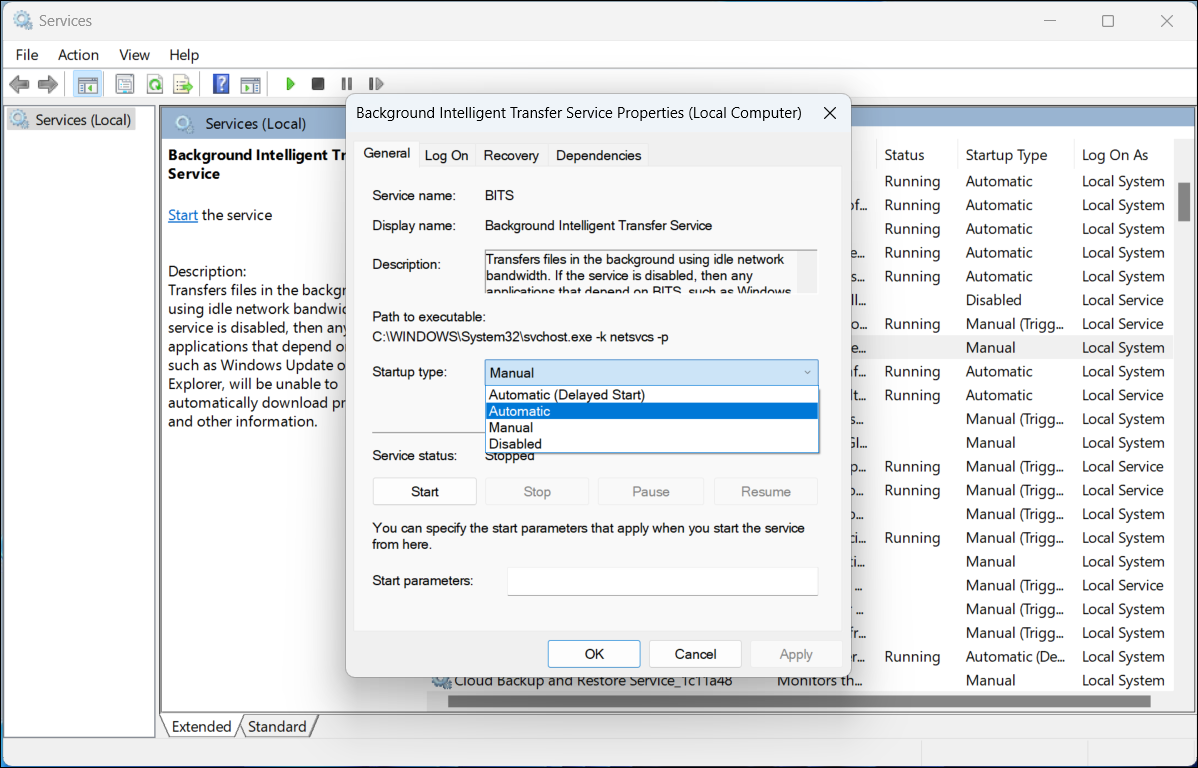 The Background Intelligent Transfer Service (BITS) and Windows Update service are crucial for downloading and installing updates and apps. Ensuring they're running properly can fix the error.
