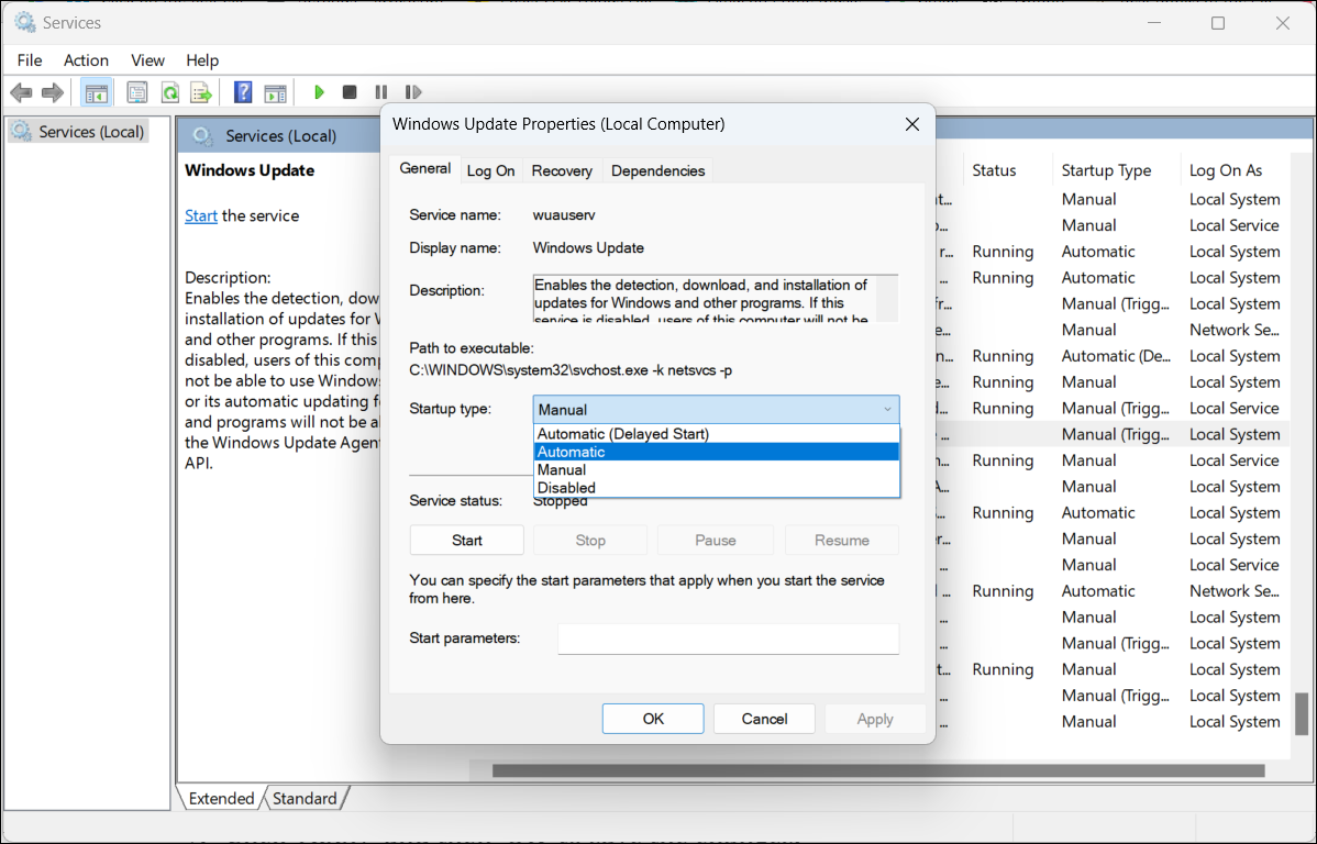 Step 4: Set the Startup type to Automatic and ensure the Service status is Running. Click Apply and then OK.