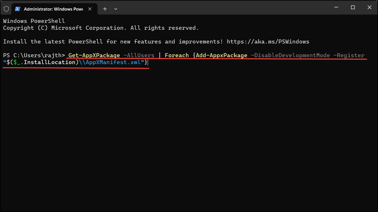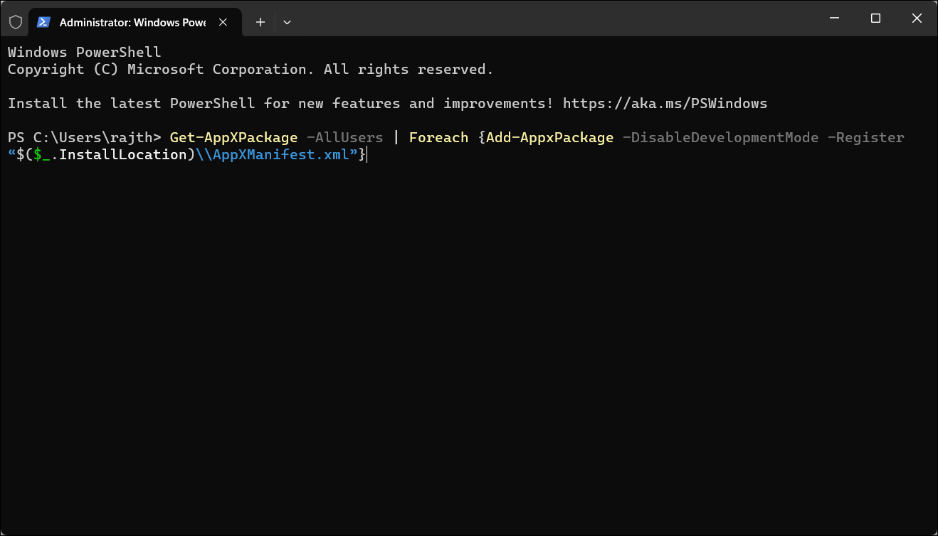 Get-AppxPackage -allusers *WindowsStore* | Foreach {Add-AppxPackage -DisableDevelopmentMode -Register "$($_.InstallLocation)\AppXManifest.xml"}Step 5: Wait for the process to complete, then restart your computer.