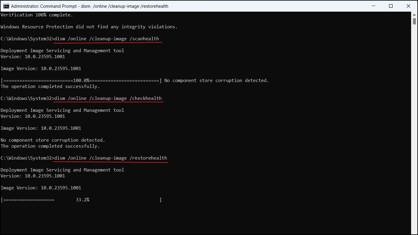 dism /online /cleanup-image /scanhealthdism /online /cleanup-image /checkhealthdism /online /cleanup-image /restorehealth