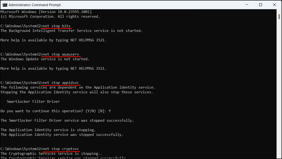 net stop bitsnet stop wuauservnet stop appidsvcnet stop cryptsvcDel "%ALLUSERSPROFILE%\Application Data\Microsoft\Network\Downloader\*.*"rmdir %systemroot%\SoftwareDistribution /S /Qrmdir %systemroot%\system32\catroot2 /S /Qregsvr32.exe /s atl.dllregsvr32.exe /s urlmon.dllregsvr32.exe /s mshtml.dllnetsh winsock resetnetsh winsock reset proxynet start bitsnet start wuauservnet start appidsvcnet start cryptsvc