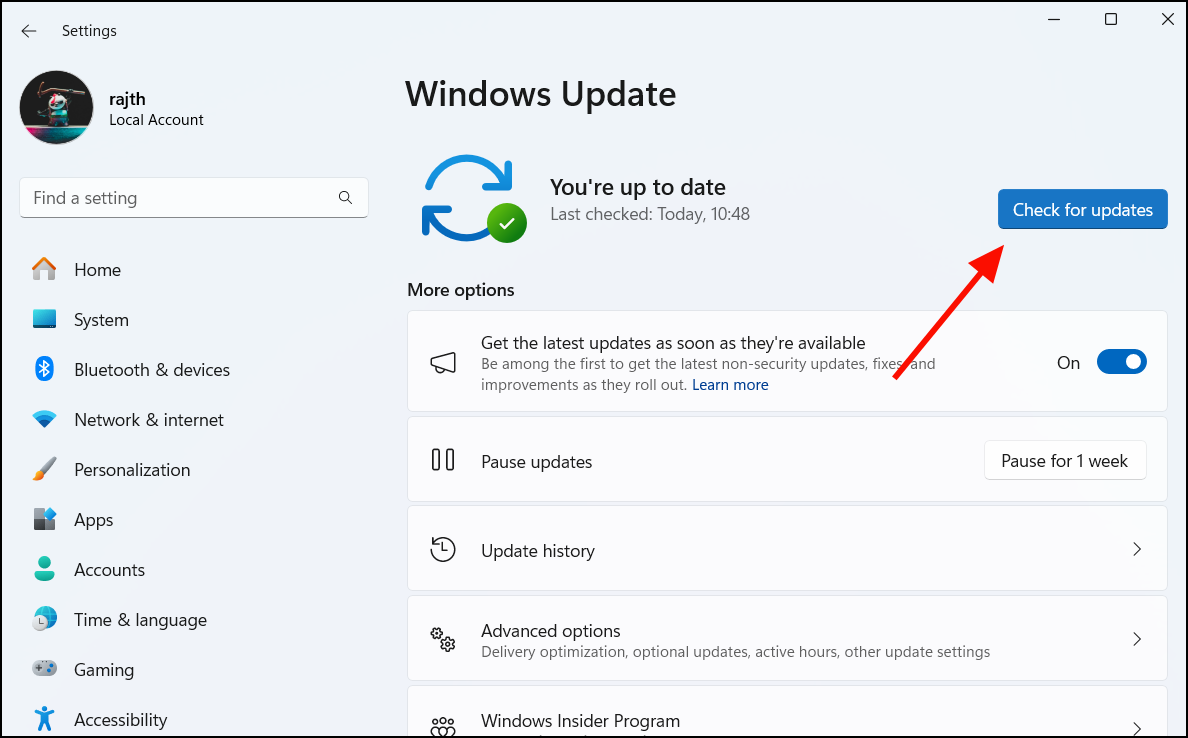 Step 3: Click on Check for updates to search for and install any available updates.