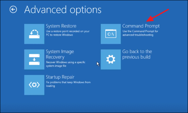 Like in the previous methods, you need to reach the ‘Advanced Options’ in ‘Repair Your System’ settings. In ‘Advanced options’ select, Command Prompt and type the following command, and press enter.