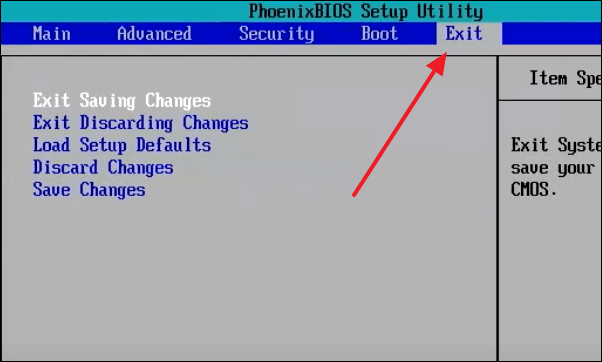 In the BIOS settings, use keyboard arrow keys to navigate between Menus. Navigate to the ‘Exit’ menu.