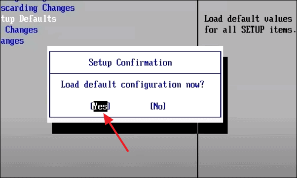 In the options you see in the Exit menu, select ‘Load Setup Defaults’ using arrow keys and press enter.