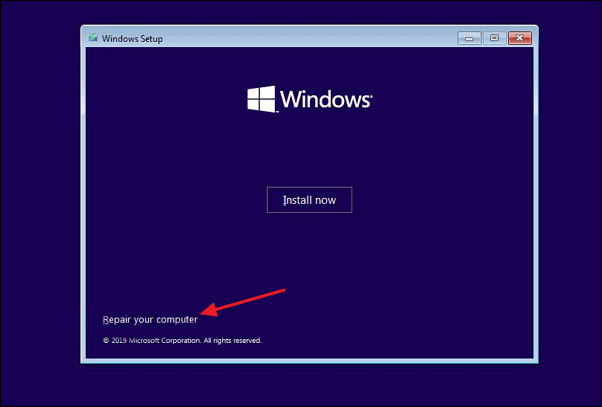 On the next screen, you see options to install or repair Windows. Click on ‘Repair Your Computer’ in the bottom-left of the screen.