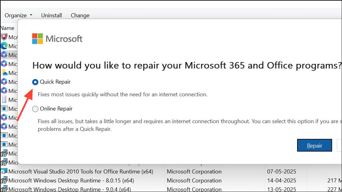 If the standard repair does not resolve the problem, try the online repair option available through the same dialog.