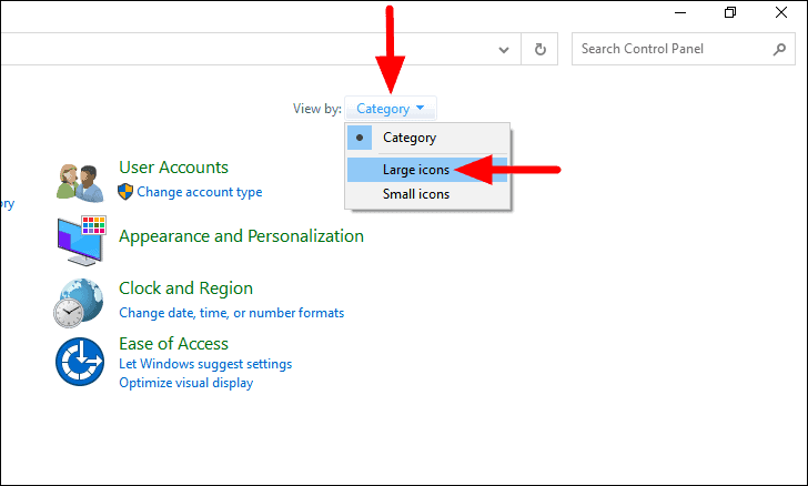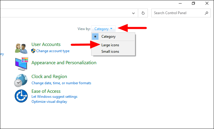 In the ‘Control Panel’, click on the box next to ‘View by’, and select ‘Large icons’ from the drop-down menu.