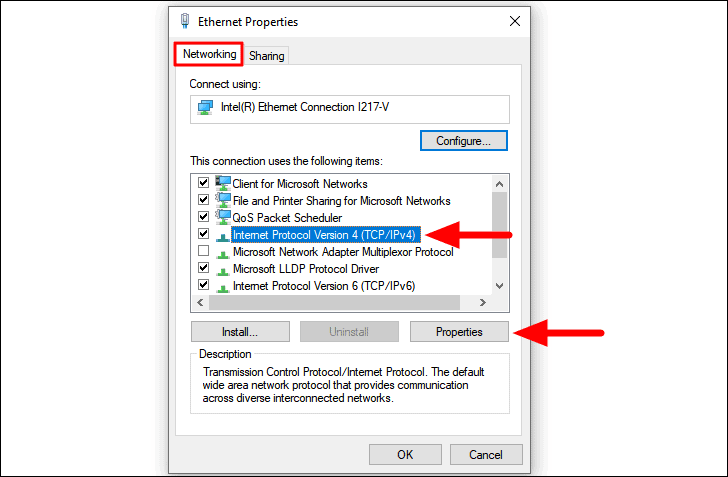 In the ‘Networking ‘ tab of the ‘Ethernet Properties’ window, locate and select the ‘Internet Protocol Version 4 (TCP/IPv4)’ option, and then click on ‘Properties’ at the bottom.