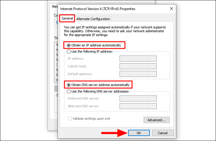 Next, check if the options to automatically obtain IP and DNS server address are selected. If not, select the options and then click on ‘OK’ at the bottom to save the changes and close the window.