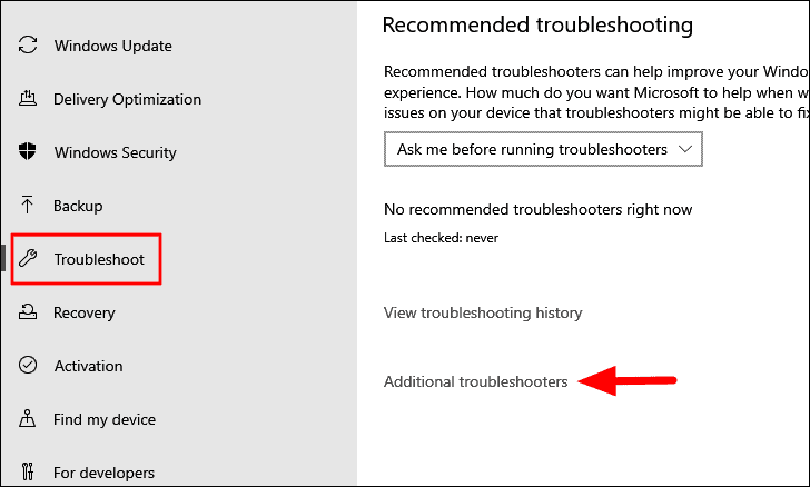 In the ‘Update & Security’ settings, you will find various tabs listed on the left. Select the ‘Troubleshoot’ tab, and then click on ‘Additional troubleshooters’ option on the right.